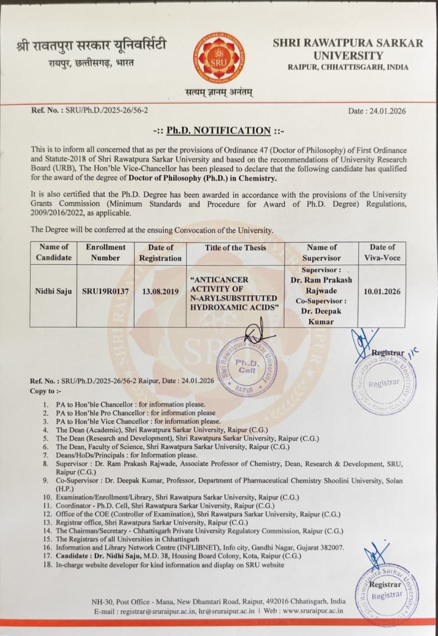 डॉ. निधि साजू ने अपना शोध कार्य श्री रावतपुरा सरकार विश्वविद्यालय, रायपुर (छ.ग.) के रसायन विज्ञान के प्रोफेसर और डीन (रिसर्च एंड डेवलपमेंट) डॉ. राम प्रकाश राजवाड़े के मार्गदर्शन में पूरा किया है। साथ ही, शूलिनी विश्वविद्यालय, सोलन (हिमाचल प्रदेश) के फार्मास्यूटिकल केमिस्ट्री विभाग के प्रोफेसर डॉ. दीपक कुमार ने इस शोध में सह-मार्गदर्शक की भूमिका निभाई।