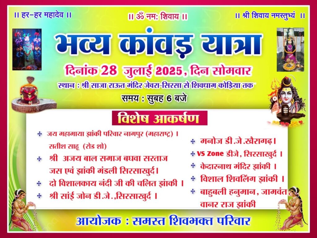 श्री साजा राऊत मंदिर जेवरा सिरसा से शिव धाम कोड़िया के लिए भव्य कांवड़ यात्रा का आयोजन आगामी 28 जुलाई, दिन सोमवार को किया जाएगा। यह यात्रा सुबह 06:00 बजे जेवरा सिरसा से प्रस्थान करेगी।