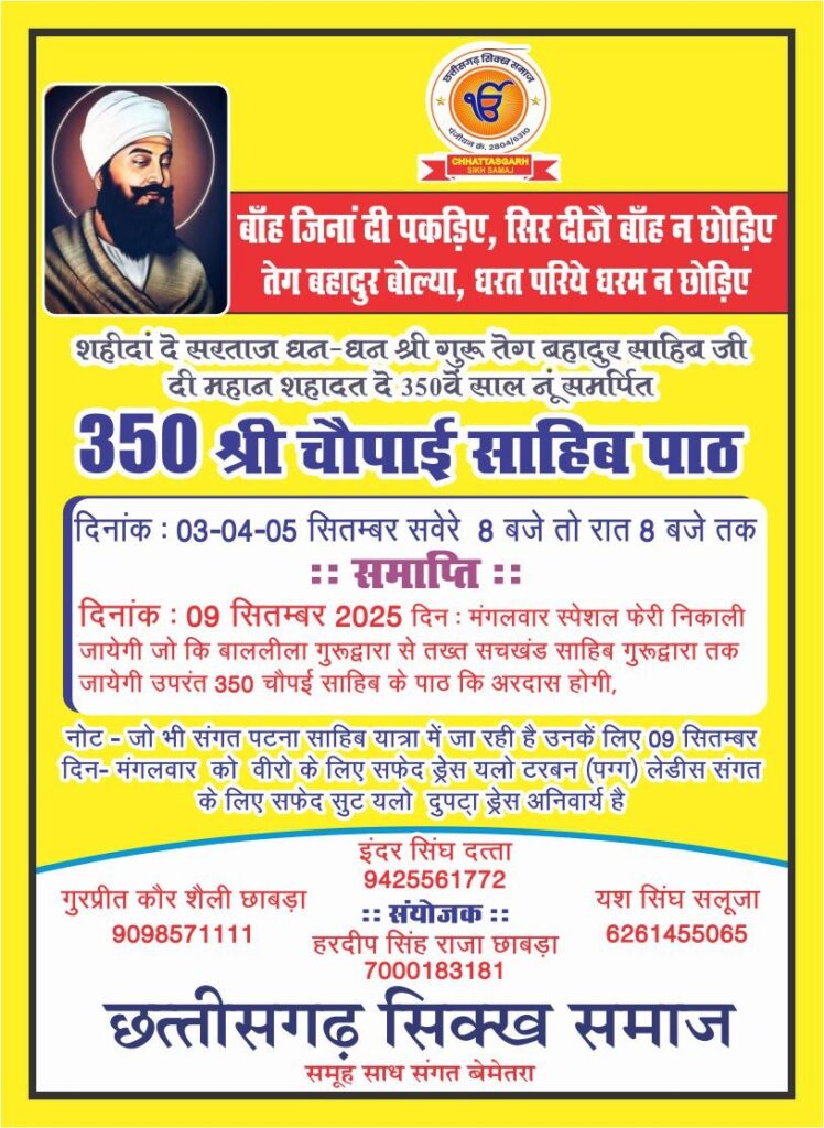 श्री गुरु तेग बहादुर साहिब जी के 350वें शहीदी पर्व के अवसर पर छत्तीसगढ़ के बेमेतरा जिले से एक भव्य तीर्थ यात्रा का आयोजन किया गया है। यह यात्रा तख्त श्री पटना साहिब गुरुद्वारा और राजगीर शीतल कुंड साहिब, बिहार के लिए रवाना हुई है। छत्तीसगढ़ सिख समाज द्वारा आयोजित यह यात्रा 7 सितंबर को रायपुर से शुरू होकर 12 सितंबर को रायपुर में ही समाप्त होगी।